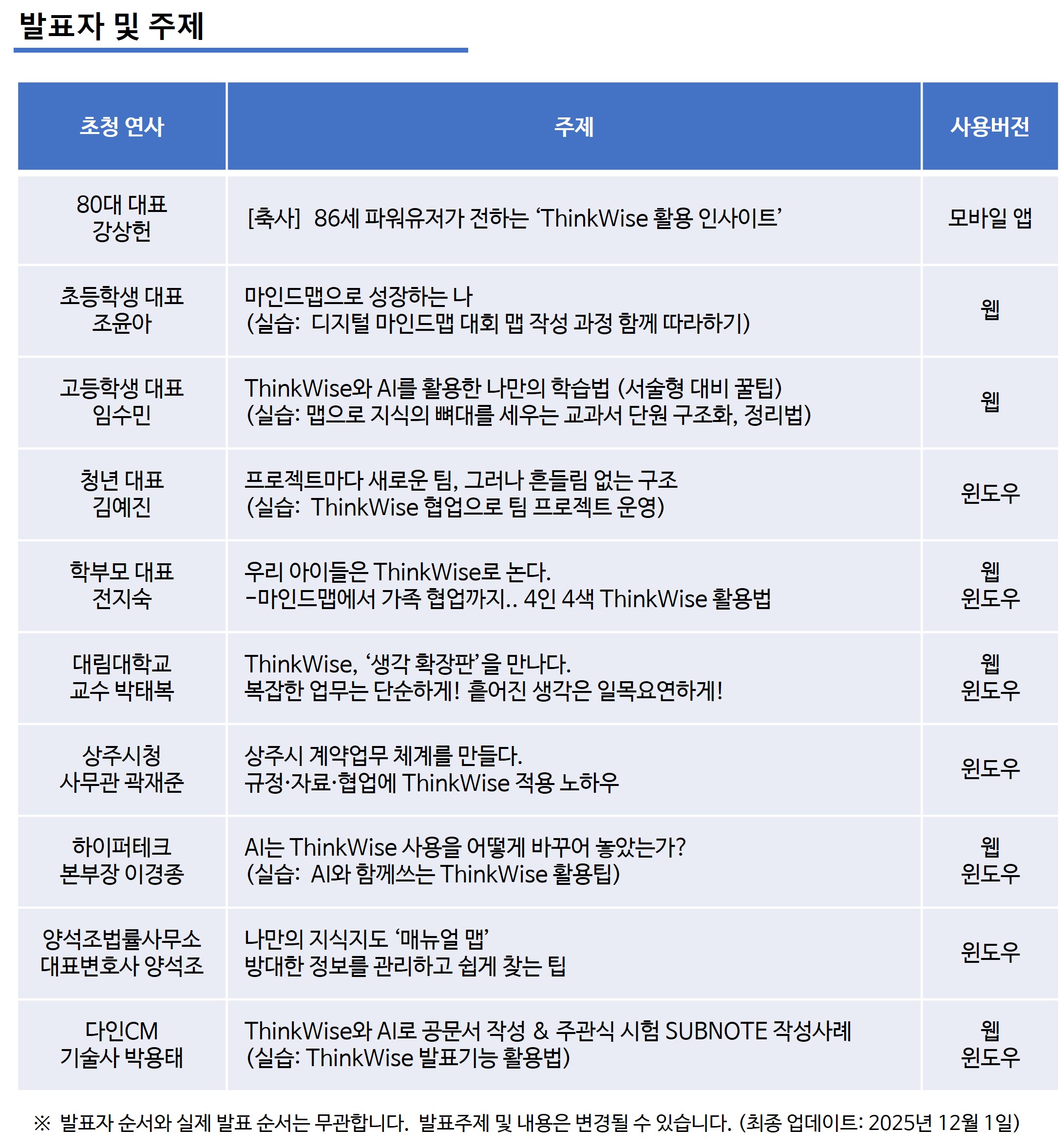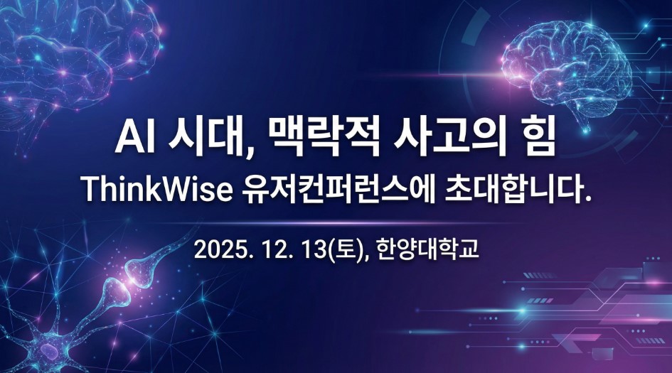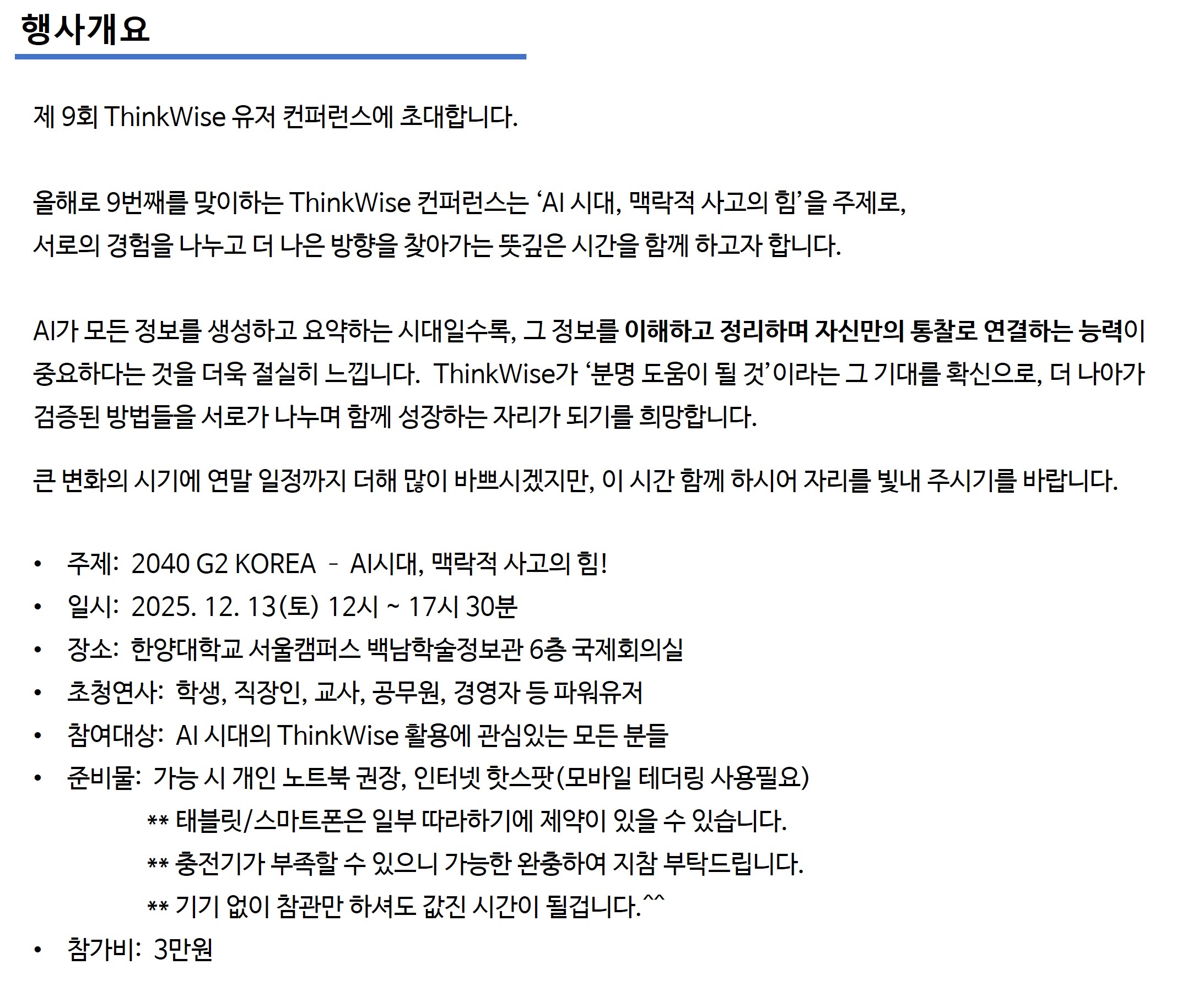제 9회 ThinkWise 유저 컨퍼런스에 여러분을 초대합니다. (12/13 토, 한양대학교 서울캠퍼스) 페이지 정보 작성자 관리자 댓글 0건 조회 2,748회 작성일 25-11-14 15:31 본문 역대 ThinkWise 유저컨퍼런스 스케치 목록 다음글 25년 10월 교육일정 안내 25.10.01