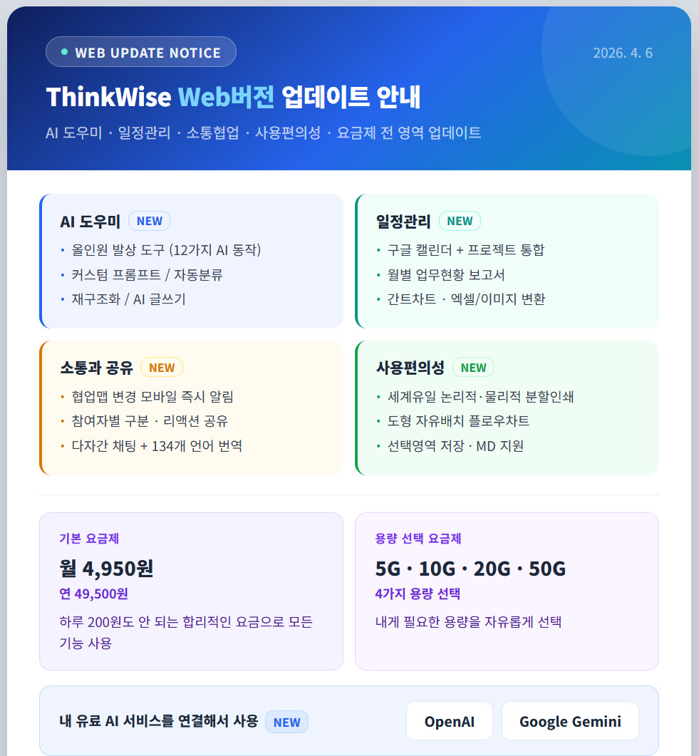 새로운 아이디어를 브레인스토밍하든, 개념을 연결하든, 절차를 따라가든, ThinkWise AI는 자연스럽고 매끄러운 사고를 위한 직관적 지원을 제공합니다.